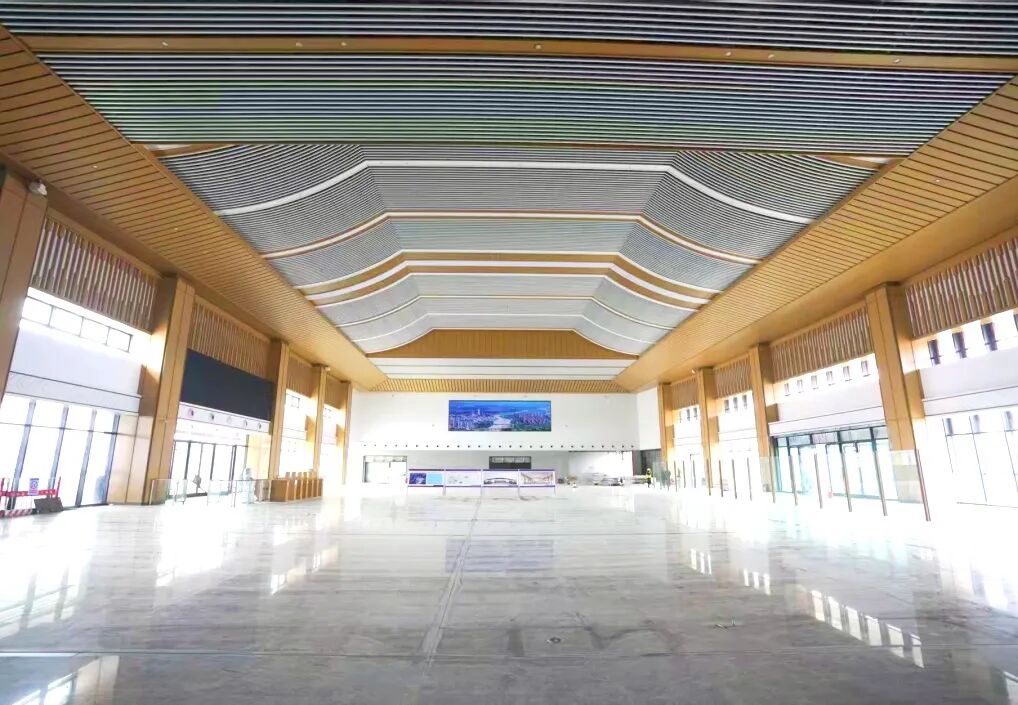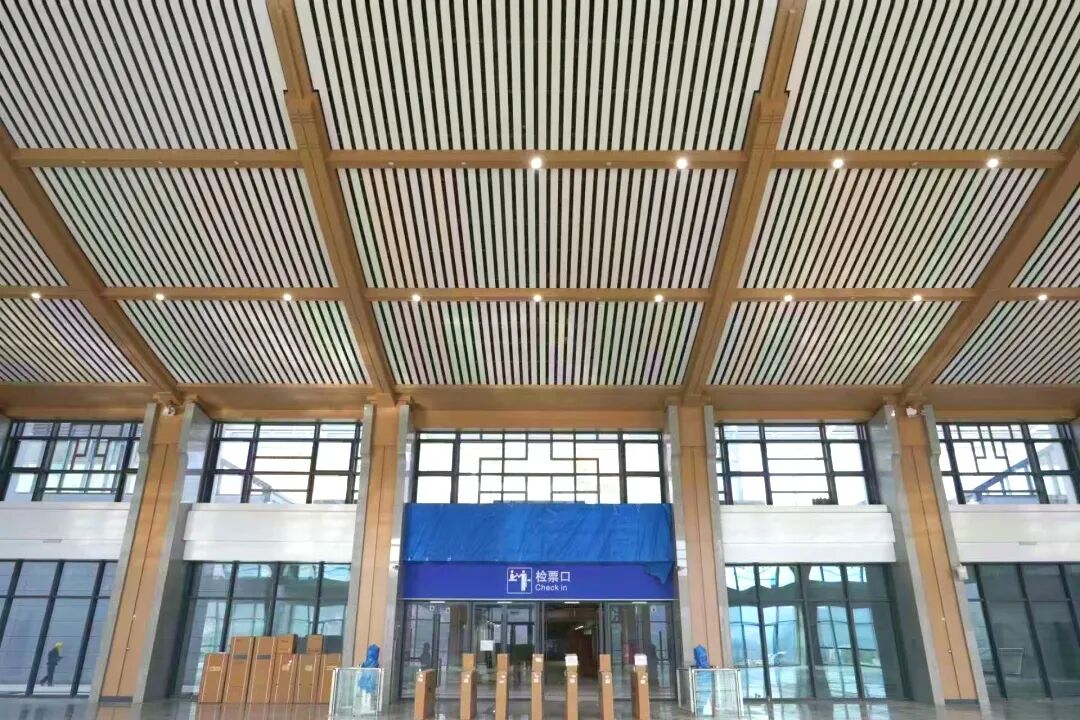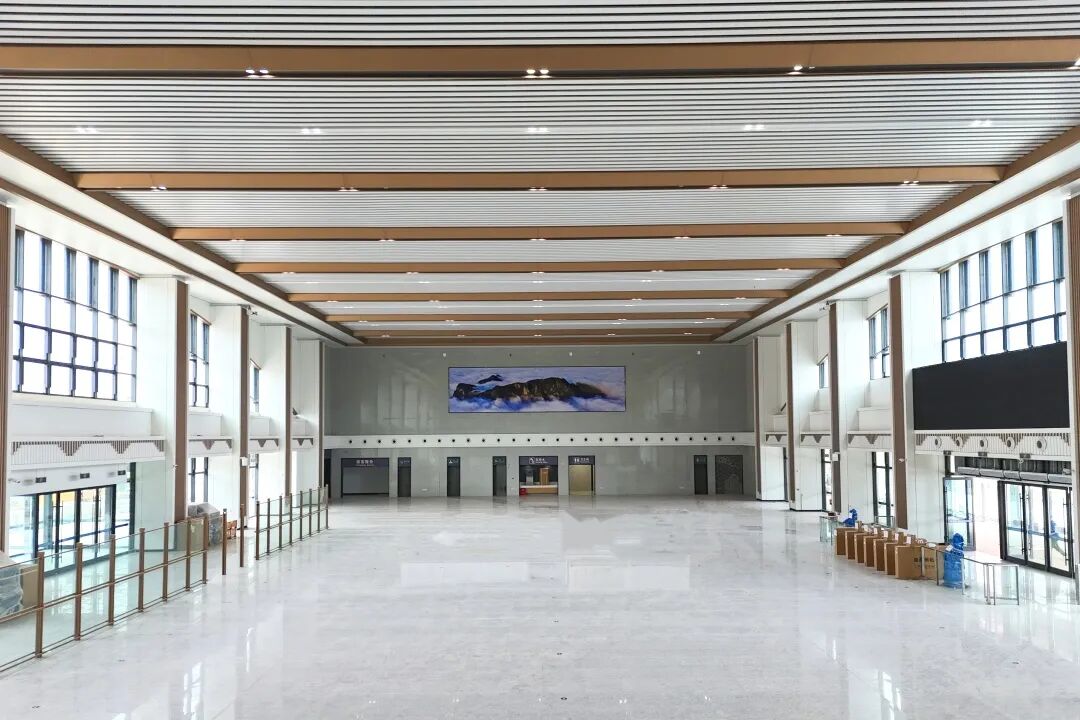 候车大厅以米白配香槟金为主色调,将蓝田玉的温润感、古建筑的典雅美和秦岭山脉的轮廓融入站房设计,充分体现地方特色。