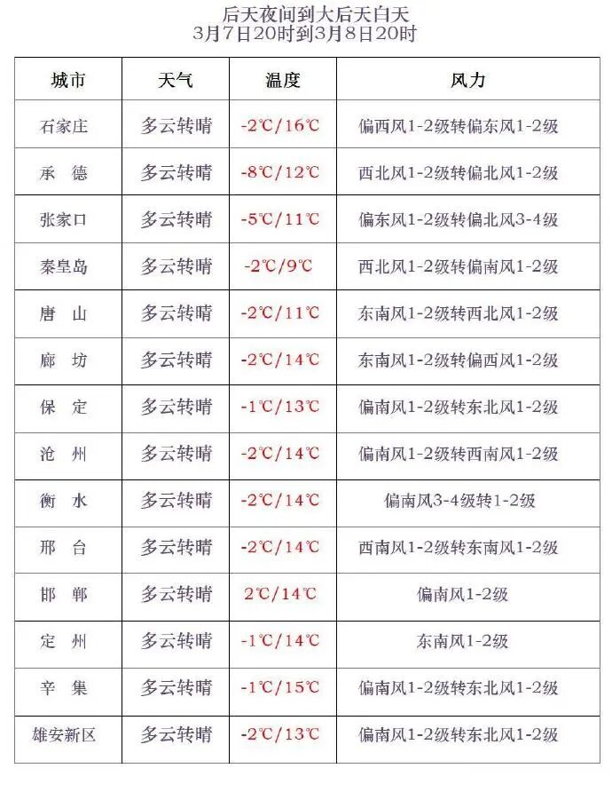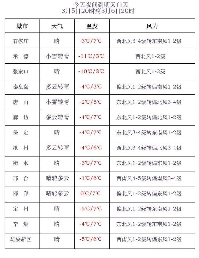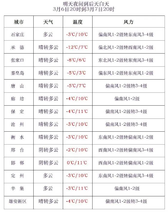 明天白天,石家庄西部、邢台西部、邯郸晴转阴,部分地区有雨夹雪,其他地区晴间多云。最高气温,张家口、承德、保定西北部、秦皇岛-9~5℃,其他地区6~8℃。