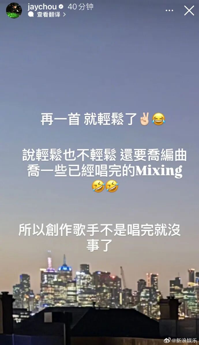 2月24日晚,周杰伦在社交平台更新限时动态,透露新专辑再一首就轻松了,还称说轻松也不轻松,还要定编曲、一些已经唱完的Mixing,“所以创作歌手不是唱完就没事了。”越来越期待了!