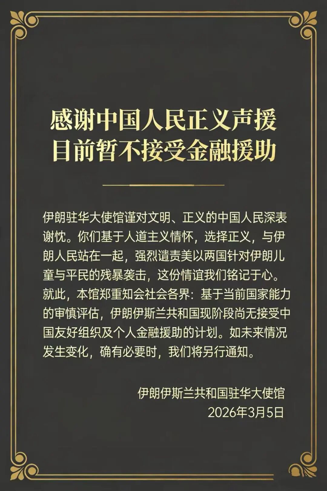 伊朗驻华大使馆3月5日在其微信公众号官方账号上发文说,感谢中国人民正义声援。