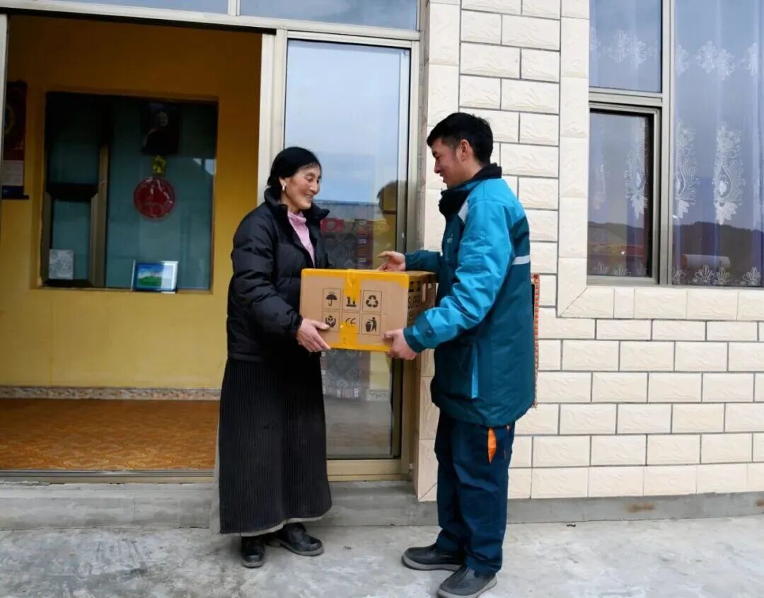 ▲哈弄夺机为俄尖卓玛阿妈送来网购的年货。图据中国邮政报
