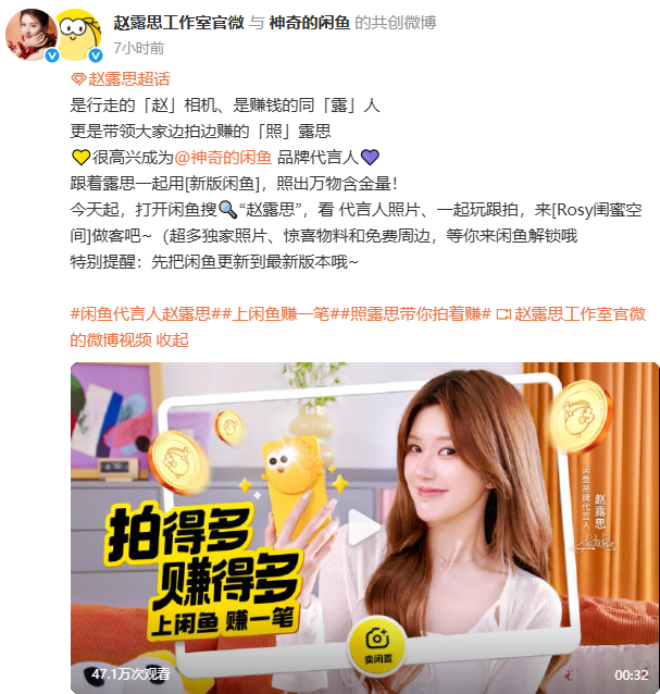 3月5日,演员赵露思工作室发文表示,赵露思成为闲鱼的品牌代言人。