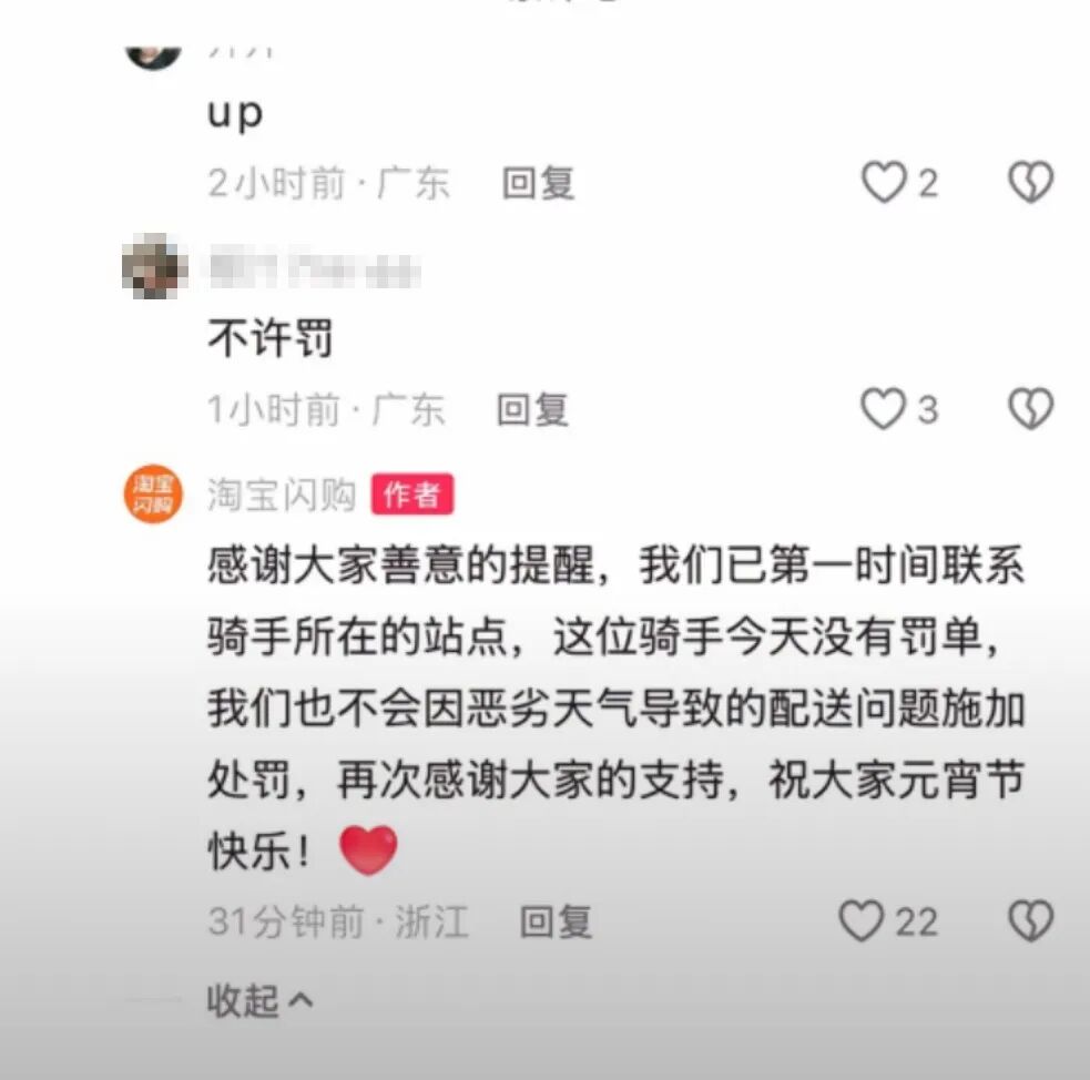 对于网友关心的情况,淘宝闪购官号在评论区称,经核实当天没有对该骑手罚单,也不会因恶劣天气导致的配送问题施加处罚。