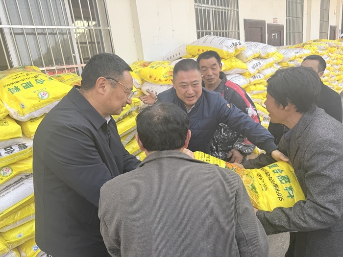 工作人员在捐赠活动现场发放化肥