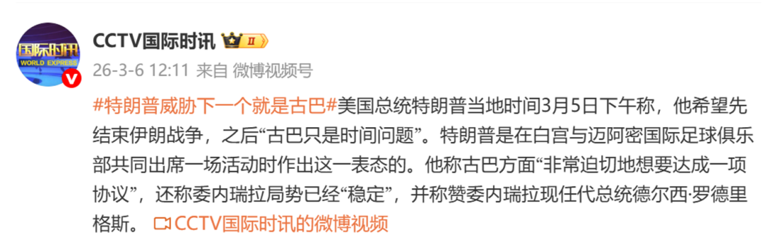 特朗普表示,古巴方面“非常迫切地想要达成一项协议”,委内瑞拉局势已经“稳定”。他还称赞了委内瑞拉现任代总统德尔西·罗德里格斯。