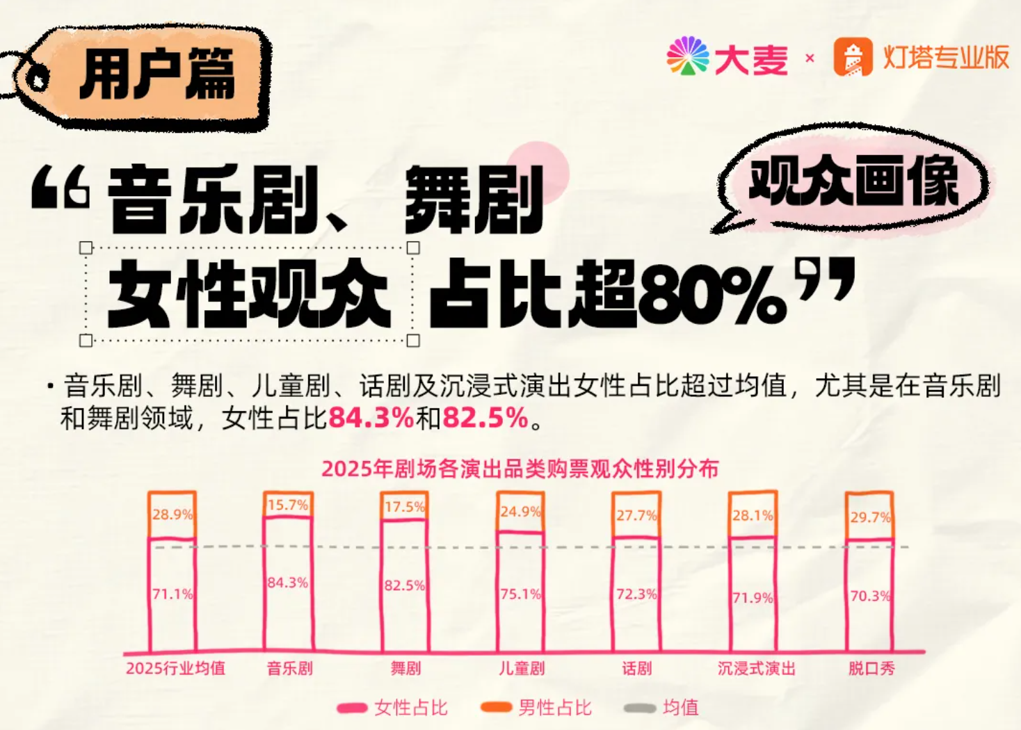 女性在剧场观演中的主力地位,在数据中得到证实。灯塔专业版和大麦近期联合发布2025年度剧场行业报告,提到女性观众占比达71.1%。