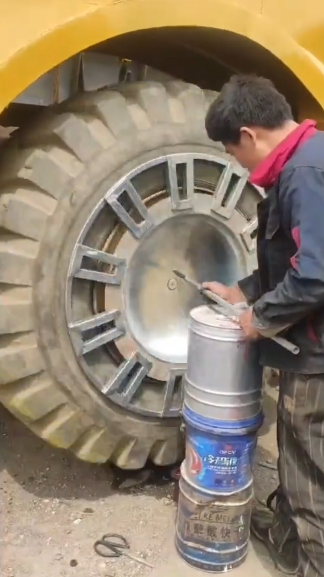 王全中给巨车安装轮胎。