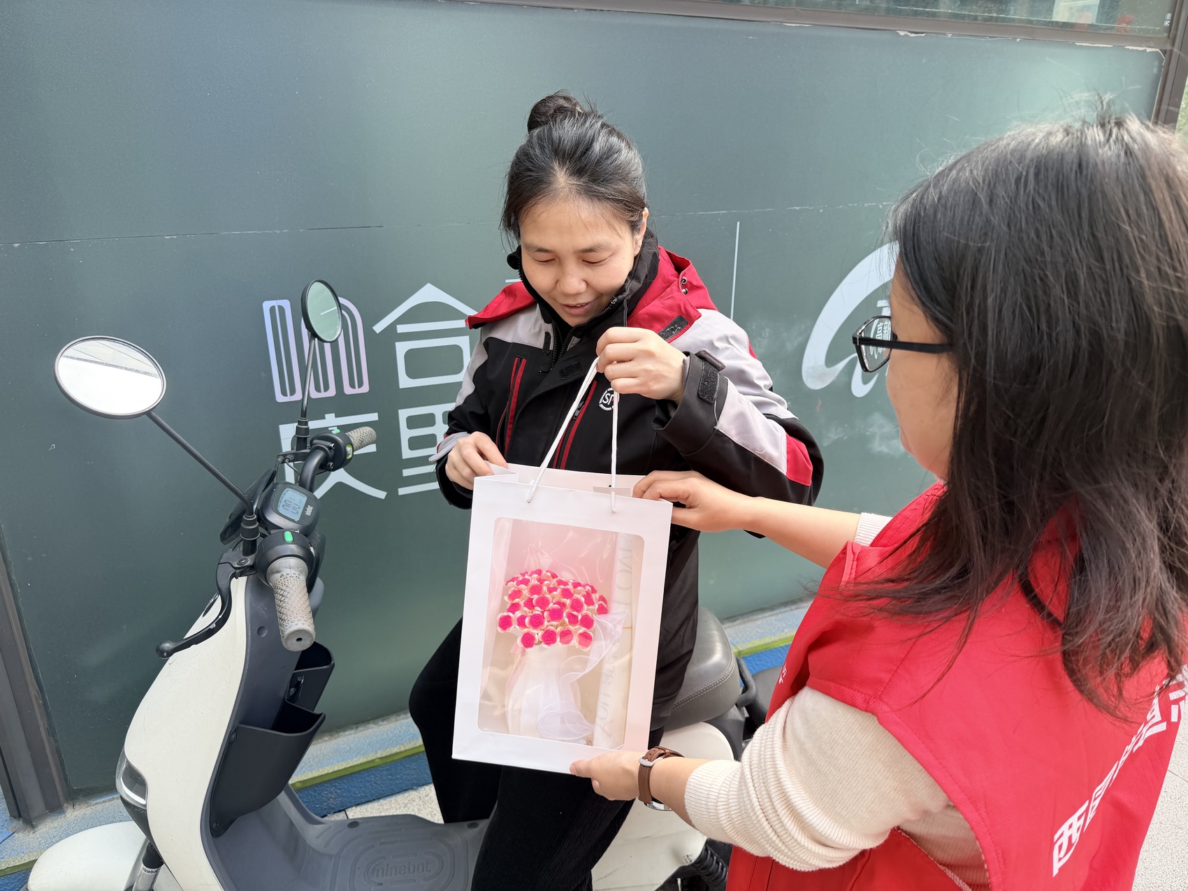 企业职工将手工制作的玫瑰赠予一线新就业群体女性从业者