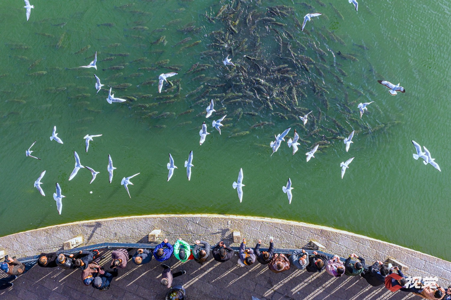 市民迎着冬日晨光,在宜宾三江口观赏成群游弋的野生鱼群与翩跹栖息的红嘴鸥。