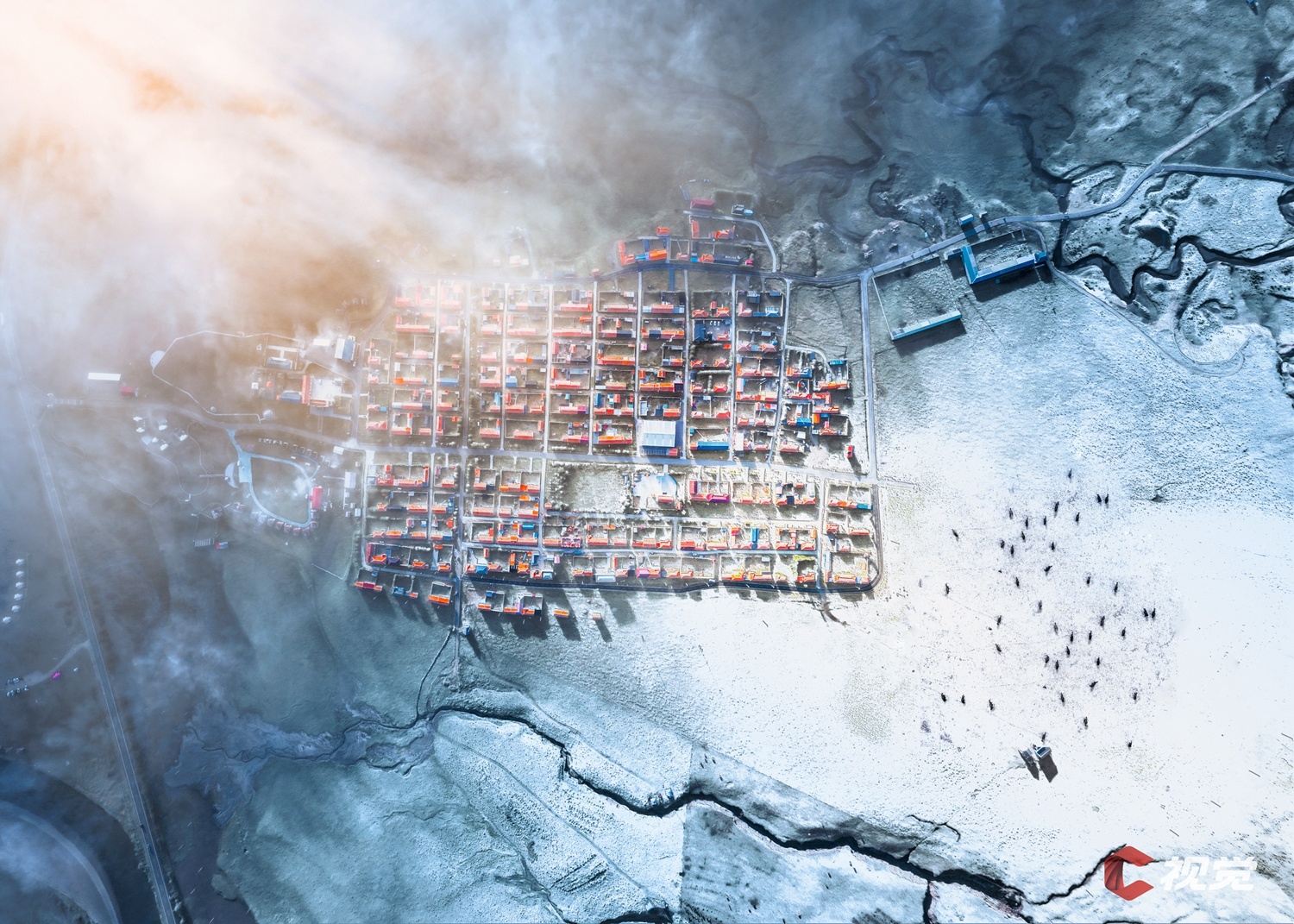 雪后的阿坝州红原县哈拉玛村宛若雪域中的明珠,在晨光下熠熠生辉。