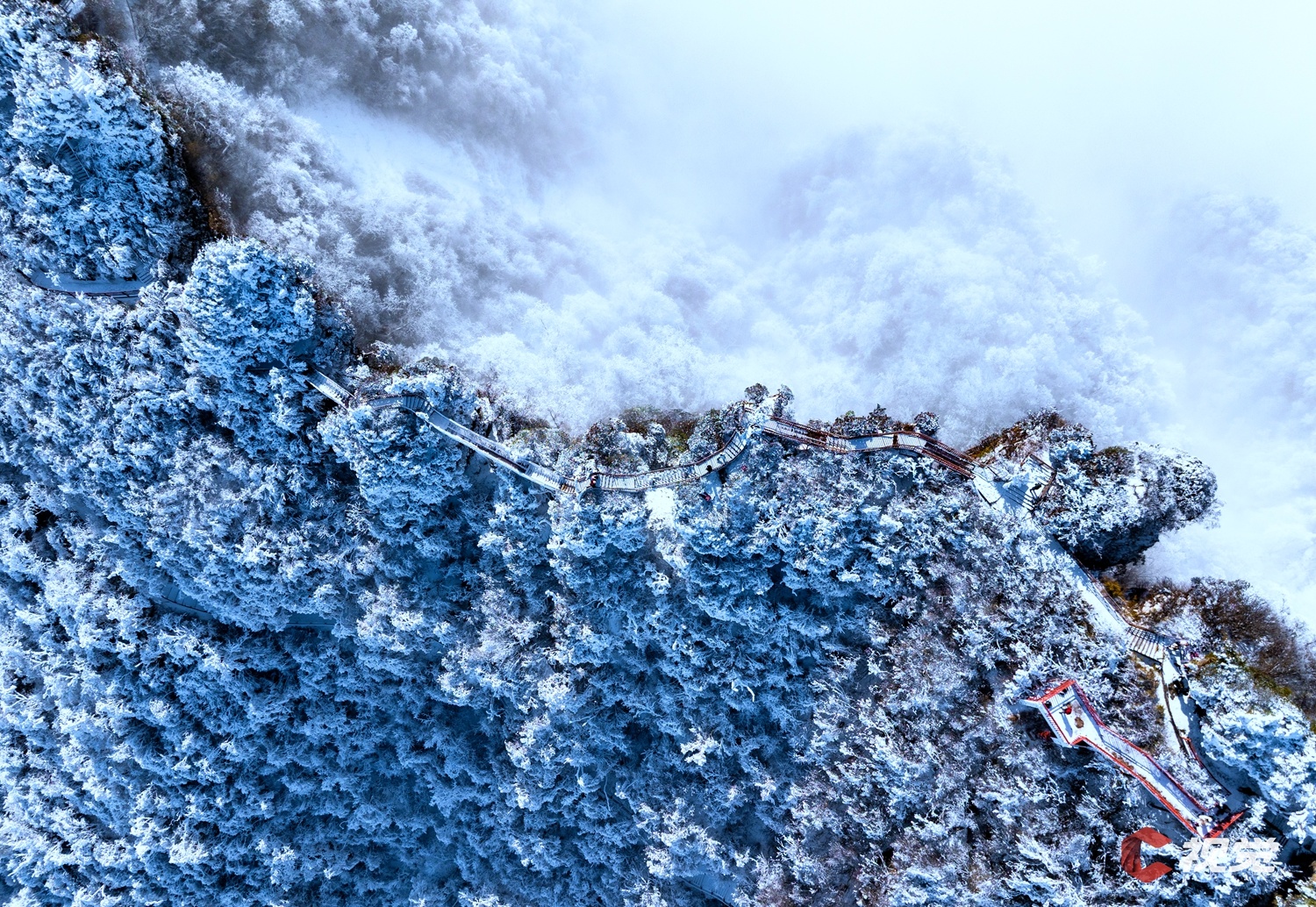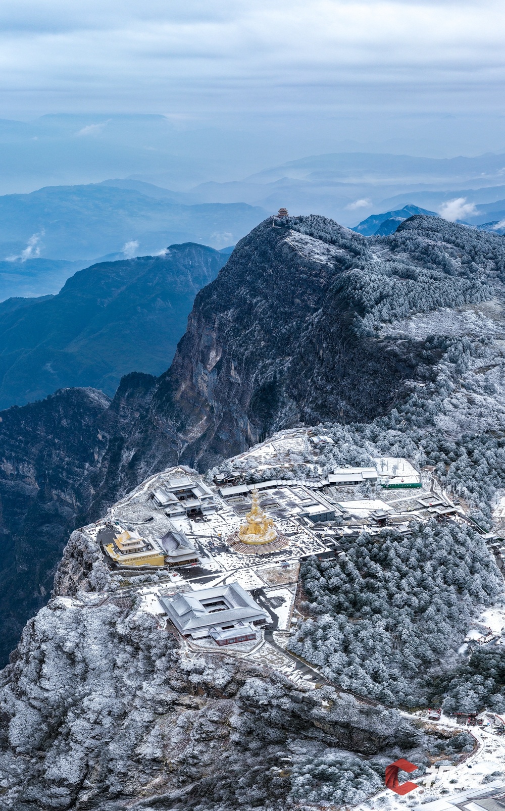 乐山市峨眉山金顶、万佛顶银装素裹,从高空俯瞰,独有的峨眉冬韵壮观非凡。