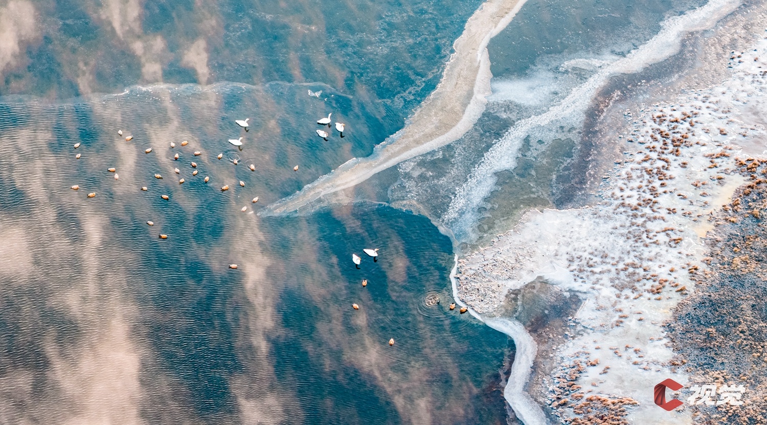 冬季的阿坝州若尔盖县麦溪乡天鹅湖,因地热而终年不冻的水面在阳光下闪烁着粼粼波光,成群的水鸟在湖面游弋。