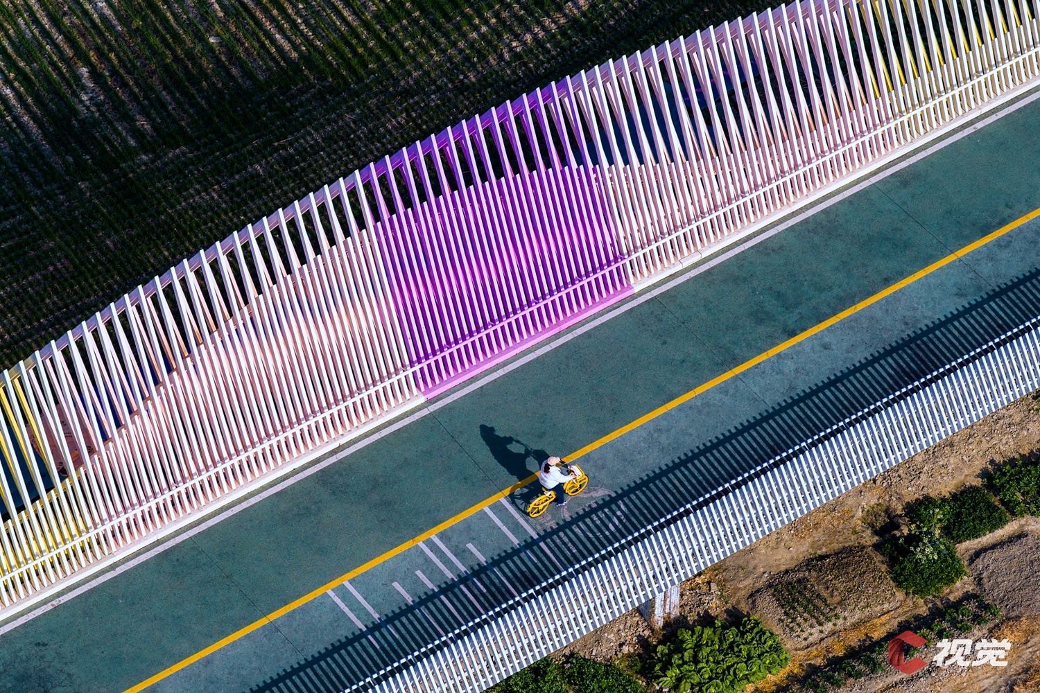 冬日暖阳下,市民在成都市郫都区的落虹桥上骑行而过,欣赏沿途美景。