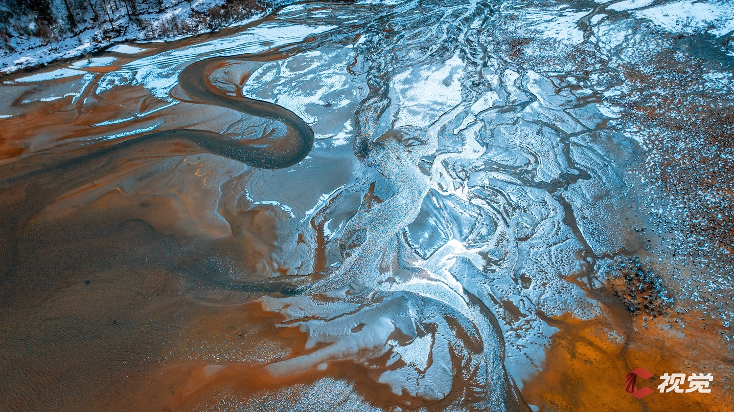 阿坝州小金县玛嘉沟,斑斓的色块在冰冻的河面上交织成画,美不胜收。