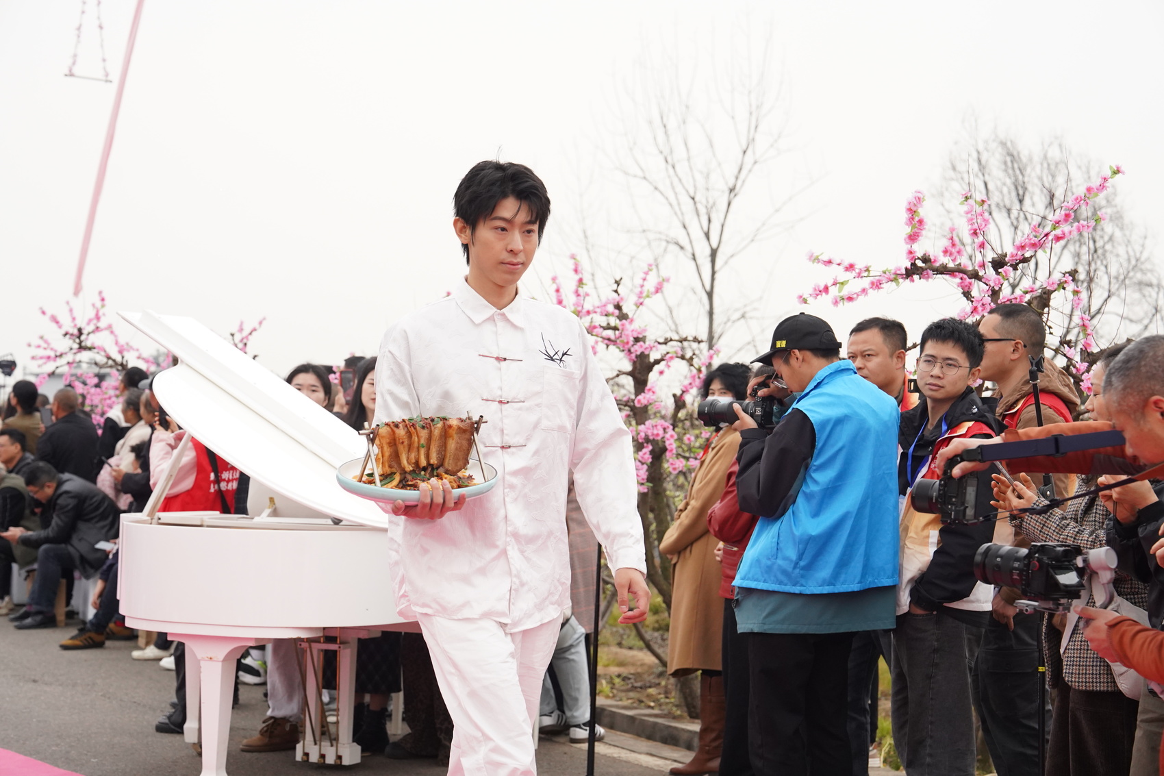 开幕式突破传统舞台模式,将万亩花海作为天然剧场。伴随着弦乐《在那桃花盛开的地方》的抒情旋律,一场别开生面的沉浸式展演在桃林间铺开。身着飘逸服饰的模特手持本地土特产,沿花海步道迤逦而行,与漫山春色相映成趣;高空“空中芭蕾”特技表演与纷扬的“花瓣雨”营造出唯美意境,音乐快闪、歌曲串烧等节目则以360度环绕式呈现,令观众置身于流动的艺术场景之中。“每年都来连山赏花,这里的风景实在太漂亮了,今年还有这么别出心裁的表演,真是不虚此行。”来自成都的游客刘女士感叹道。