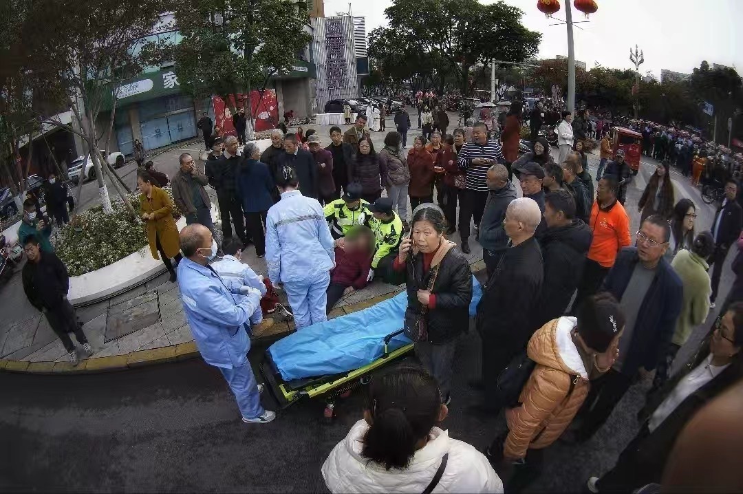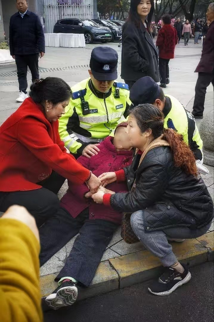 刘盛成立即通过对讲机向指挥中心汇报情况,同步拨打120急救电话,并俯身轻声安抚老人,密切观察其生命体征;胡志鹏快速疏散周边围观群众,及时开辟生命通道,避免人群拥挤造成二次伤害,同时疏导现场交通,确保救护车通行顺畅。