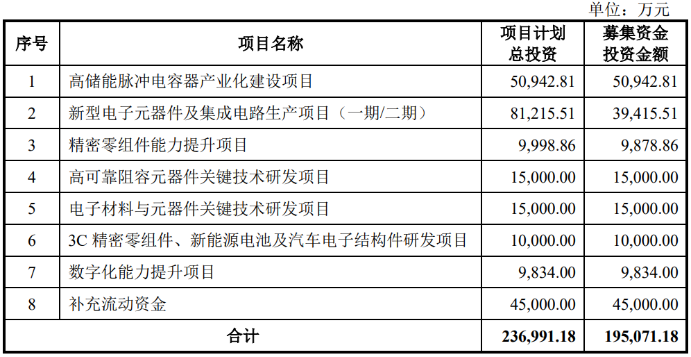 本次IPO,宏明电子拟将19.51亿元募集资金投向8个项目,重点围绕产能扩充与技术攻关展开。其中,高储能脉冲电容器产业化建设项目拟投资5.09亿元,实现关键元件国产化,解决高端装备卡脖子技术问题;新型电子元器件及集成电路生产项目(一期/二期)计划投入8.12亿元(拟投入募集资金3.94亿元),项目建成后形成年产4亿只高可靠高容体比多层瓷介电容器产能,以巩固公司在高可靠MLCC行业地位;精密零组件能力提升项目将投资近亿元,进一步强化3C精密零组件及汽车电子结构件生产能力。