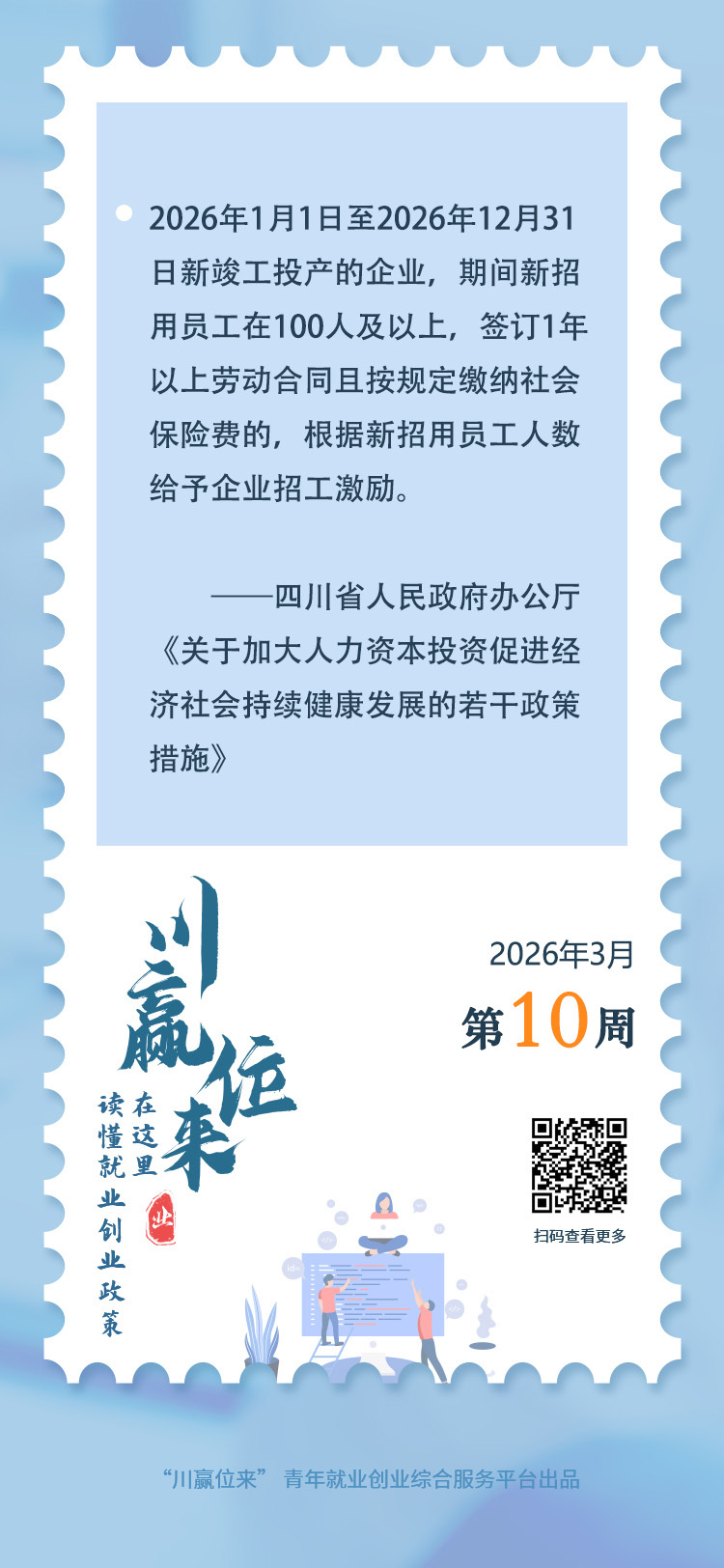 四川省将对新竣工投产企业招工进行激励。根据四川省人民政府办公厅近日印发的《关于加大人力资本投资促进经济社会持续健康发展的若干政策措施》,2026年1月1日至2026年12月31日新竣工投产的企业,期间新招用员工在100人及以上,签订1年以上劳动合同且按规定缴纳社会保险费的,根据新招用员工人数,给予企业招工激励。