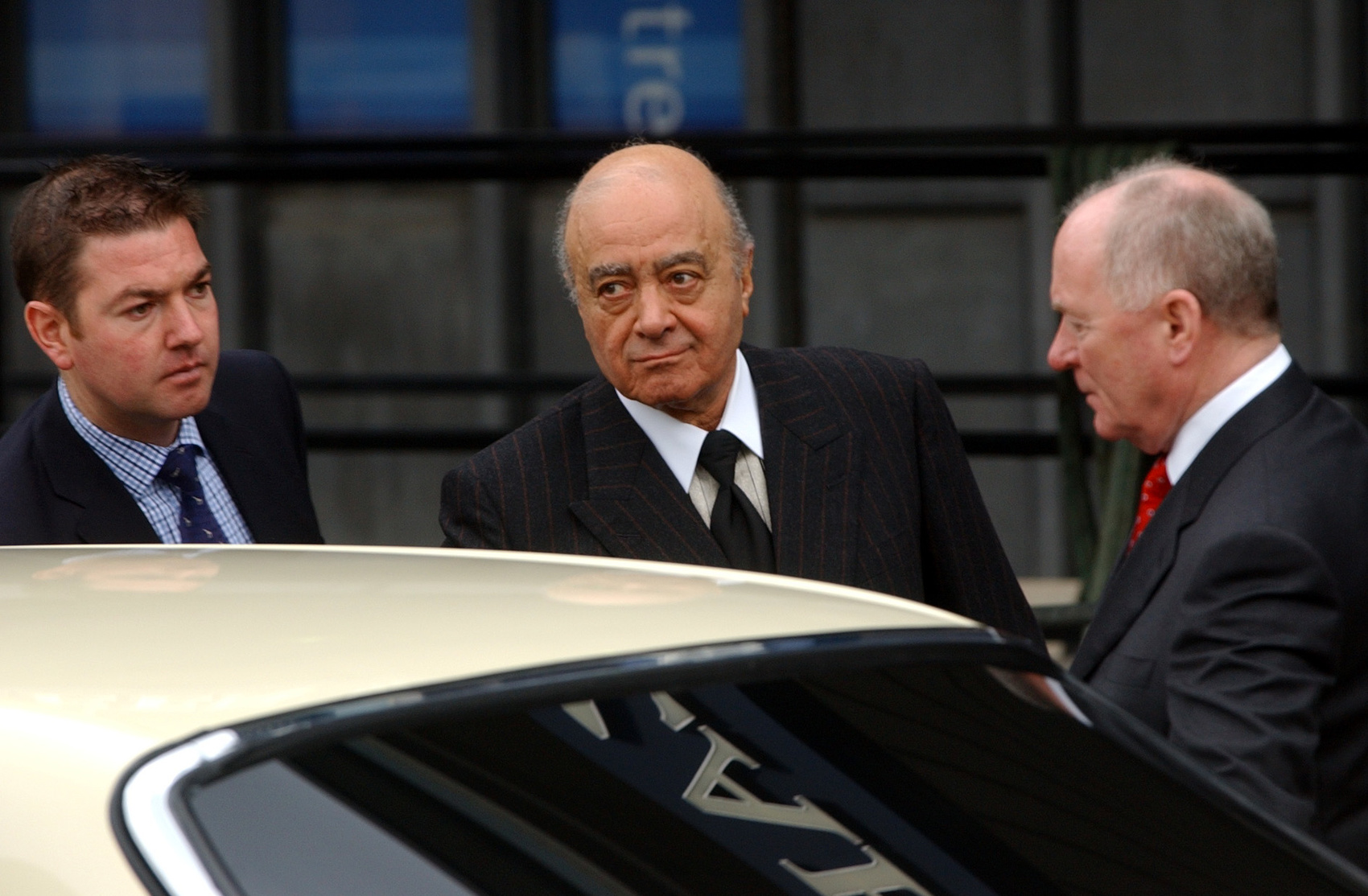 2004年1月6日,穆罕默德·法耶兹(中)在接受调查人员的询问后离开伦敦伊丽莎白女王会议中心(资料照片)。图据新华社