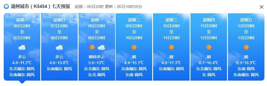 而浙北地区今天一直被厚厚的云层覆盖,大部地区最高气温仅12~13℃,最冷的湖州仅11.3℃。