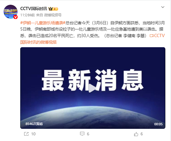 总台记者今天(3月6日)自伊朗方面获悉,当地时间3月5日晚,伊朗南部城市设拉子的一处儿童游乐场及一处应急基地遭到美以袭击。据悉,袭击已造成20名平民死亡,约30人受伤。