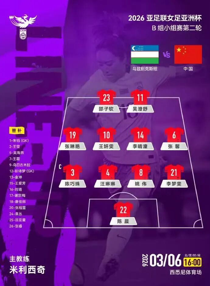 相比首战孟加拉国女足,中国女足此战更换了9名首发,只保留了中后卫汪琳琳和门将陈晨。