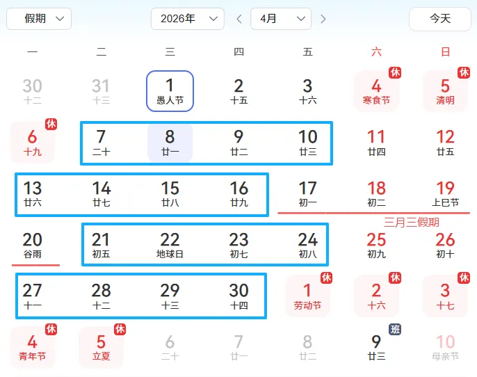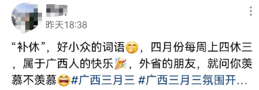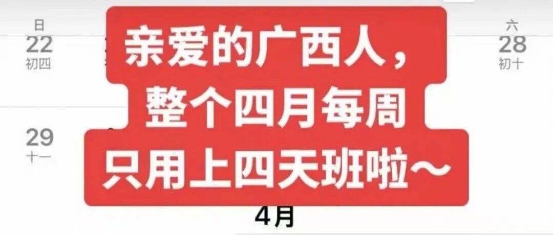 3月5日,有热心网友发现:整个4月份,广西人每周只用上4天班!清明、三月三、五一假期依次衔接,广西人周周都能享受小长假,这一消息立刻引发全国网友围观,评论区里羡慕声一片。