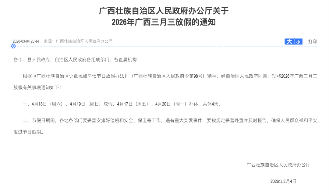 3月4日,广西壮族自治区人民政府办公厅官宣:2026年“广西三月三”放假时间为4月17日至20日,连休4天。