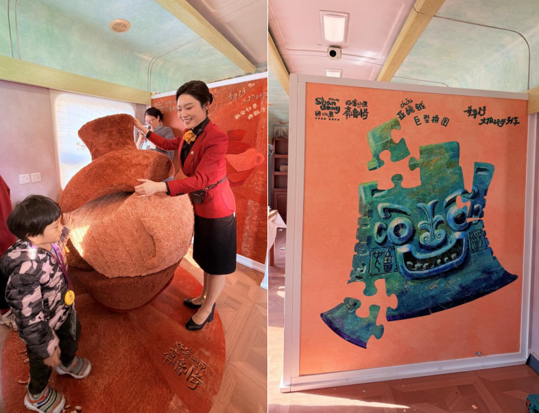 列车上还有两节特色娱乐车厢。娱乐A车厢主打互动体验与文博科普,车厢内精心设置软绘本、文物森林、古今器物连连看等10余项寓教于乐的互动游戏。借助AI科技赋能,旅客拍照即可解锁文物解读,互动游戏、集章寻宝等玩法让知识传播趣味盎然。可看、可玩、可学、可晒的沉浸式场景,有效破解文博传播难题,让历史文化可感可触、可亲可近,真正实现文物动起来、活起来、传开来。