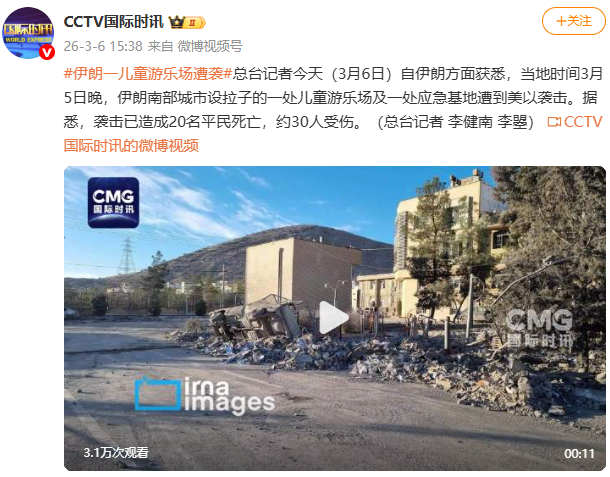 总台记者今天(3月6日)自伊朗方面获悉,当地时间3月5日晚,伊朗南部城市设拉子的一处儿童游乐场及一处应急基地遭到美以袭击。据悉,袭击已造成20名平民死亡,约30人受伤。