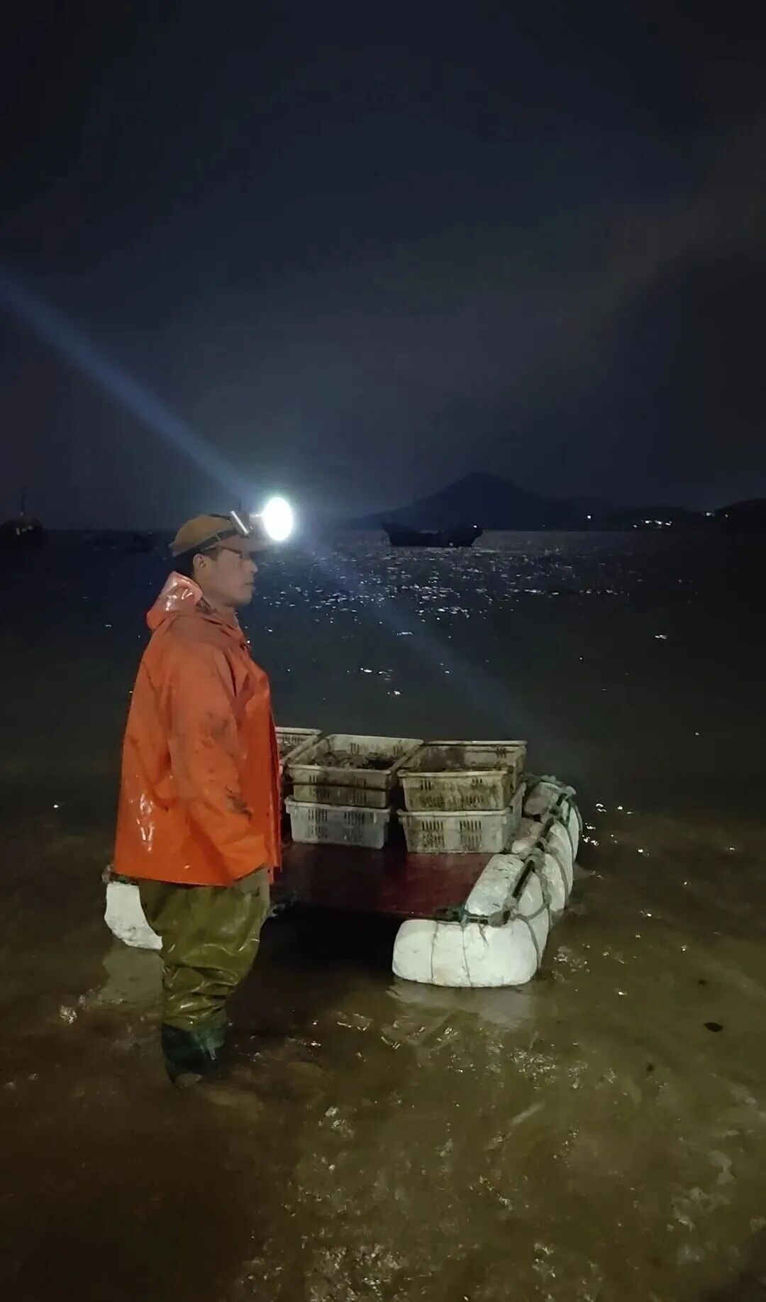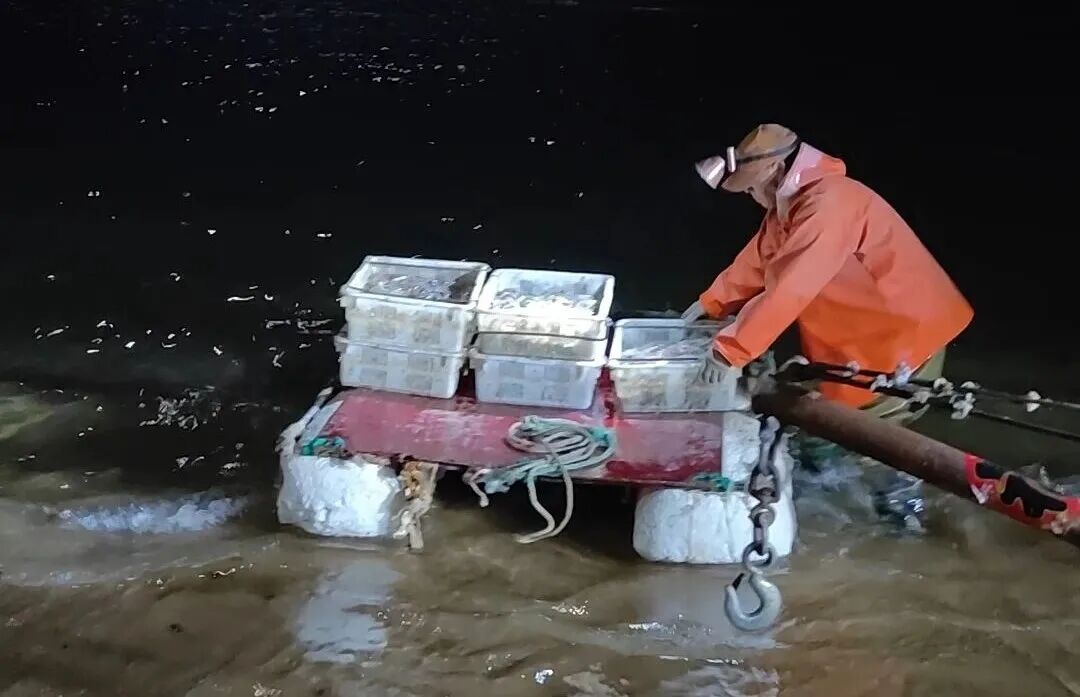 凌晨四点,岸边浅滩上亮着几束头灯的光,附近村庄的渔船摸黑出海,清晨三四点钟,收网的船陆续归来。渔民蹚着冰凉的潮水,把渔获从船上拖上岸。这里的渔获上岸方式很特别——若渔获量大,船会停靠码头;量小时,则直接泊在近岸海滩。渔民们再一次次蹚着水,一筐接一筐把收获的鱼虾等拖上岸。