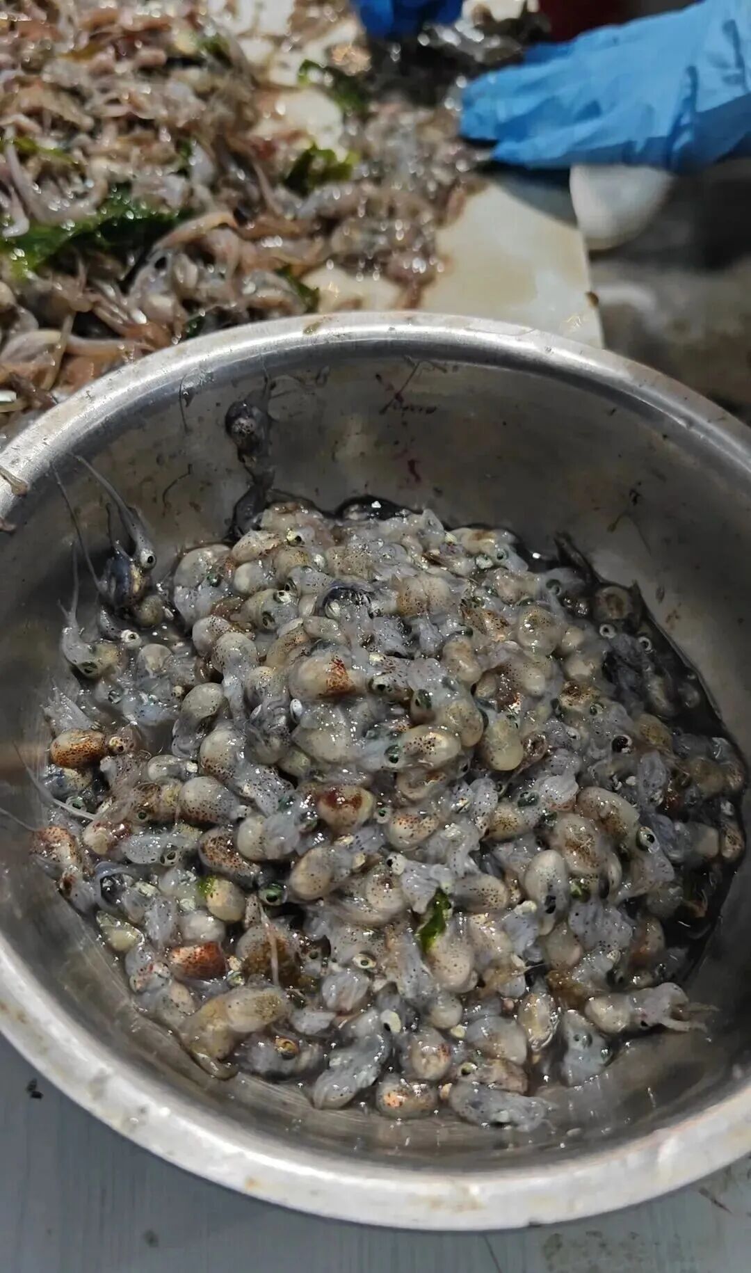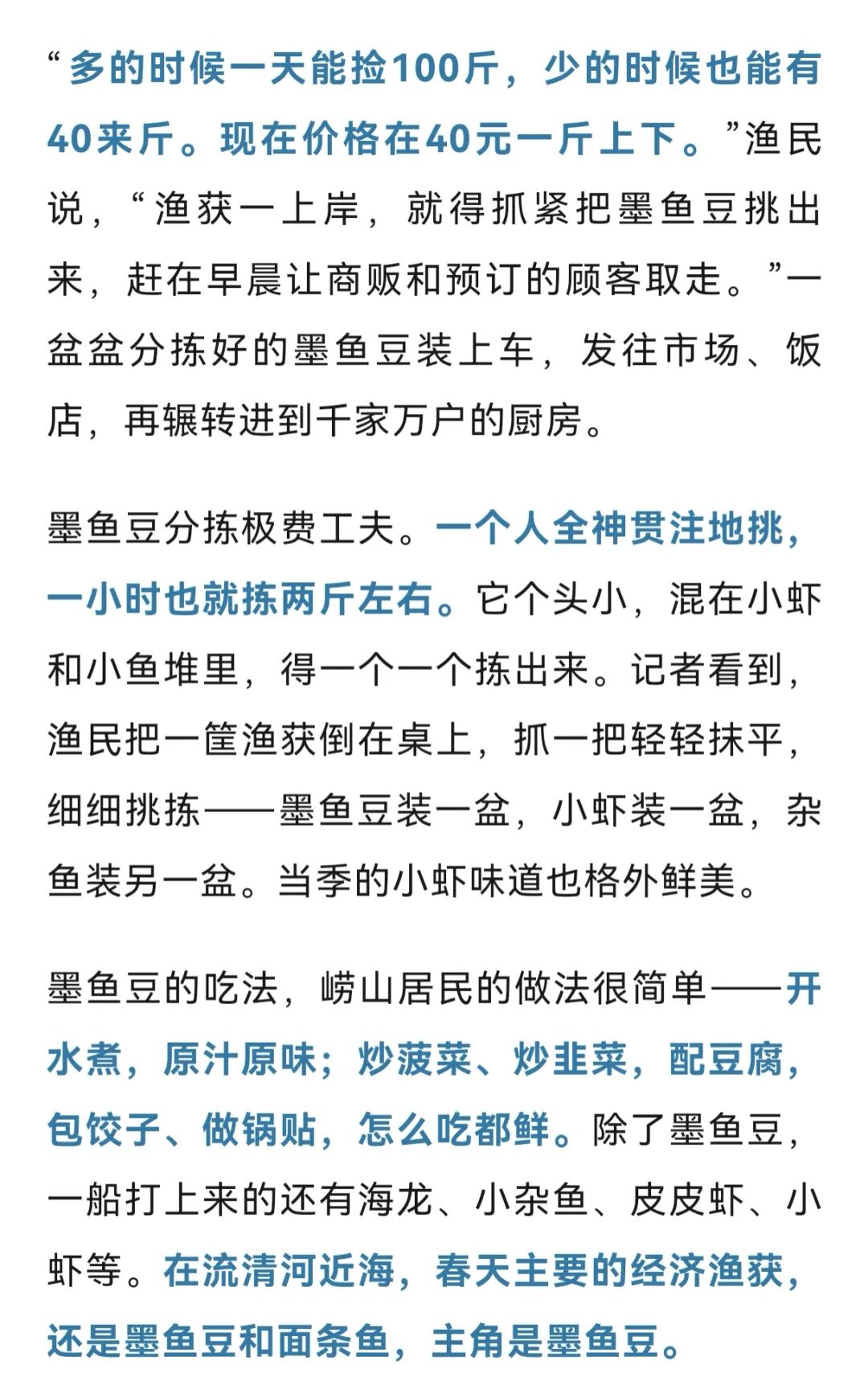 灯影里,筐中的墨鱼豆夹杂着小鱼小虾。墨鱼豆只有小拇指肚大小,却是开春第一口鲜。岸边,附近的居民已借着灯光开始分拣,动作熟稔。渔民告诉记者,流清河近海每年都有这口鲜。其实过年前墨鱼豆就开始露面,但那时量少,饱满度和鲜度都不够。今年正月十四前后才开始上量,捕捞能一直持续到五一,但要论最鲜的时节,就是眼下。