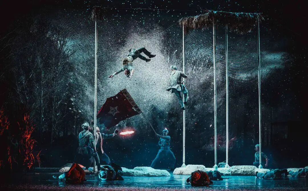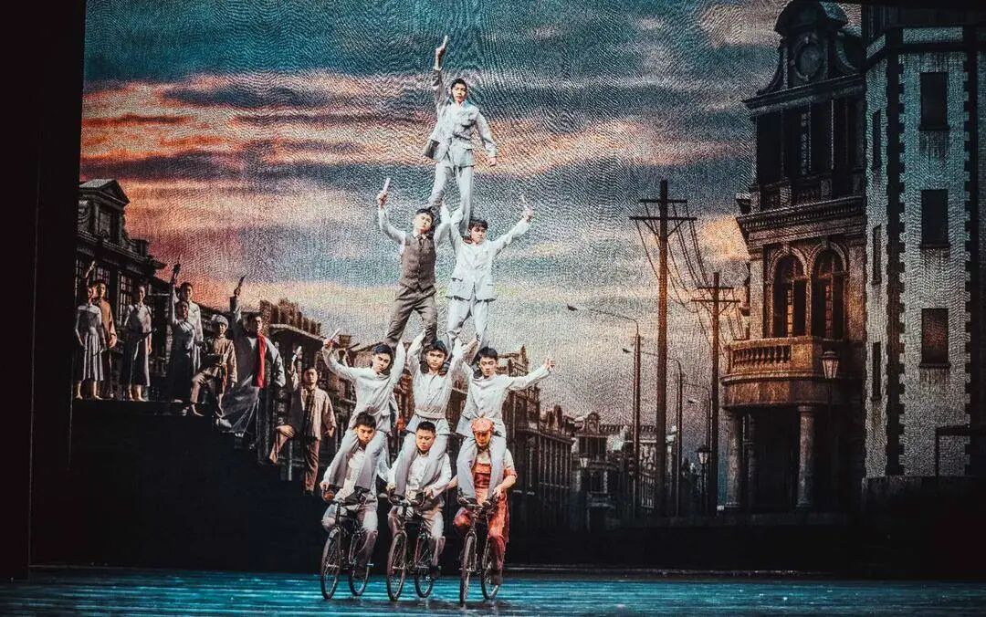 从剧场版到巡演版,是一次从技术编排到舞台呈现的系统性升级。“舞美团队对高空道具、灯光布景进行了升级优化。”《先声》总导演李春燕解释,不同于其他剧种,杂技剧对道具要求很高,空中装置、爬竿、绸吊等不仅要满足演出功能,还要保障安全,为了实现巡演的快速装台精准复刻,剧组对整体置景进行了调整。