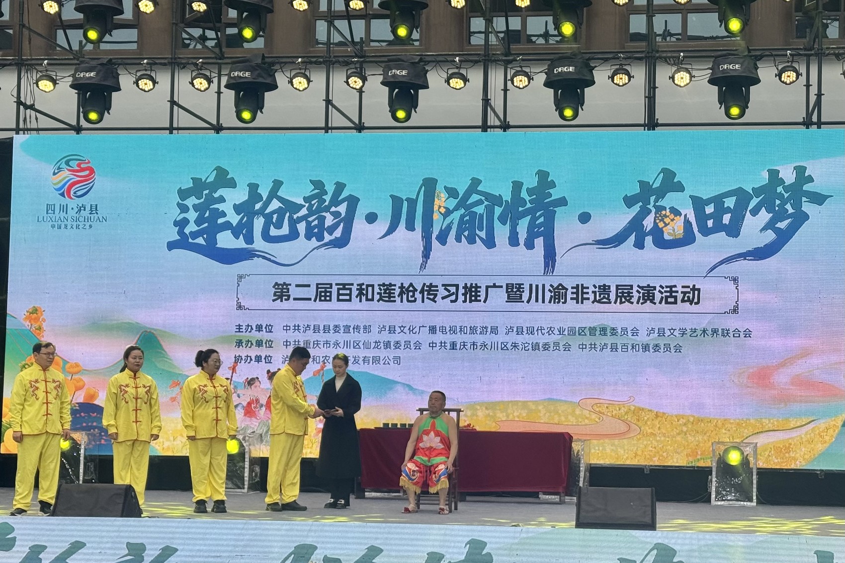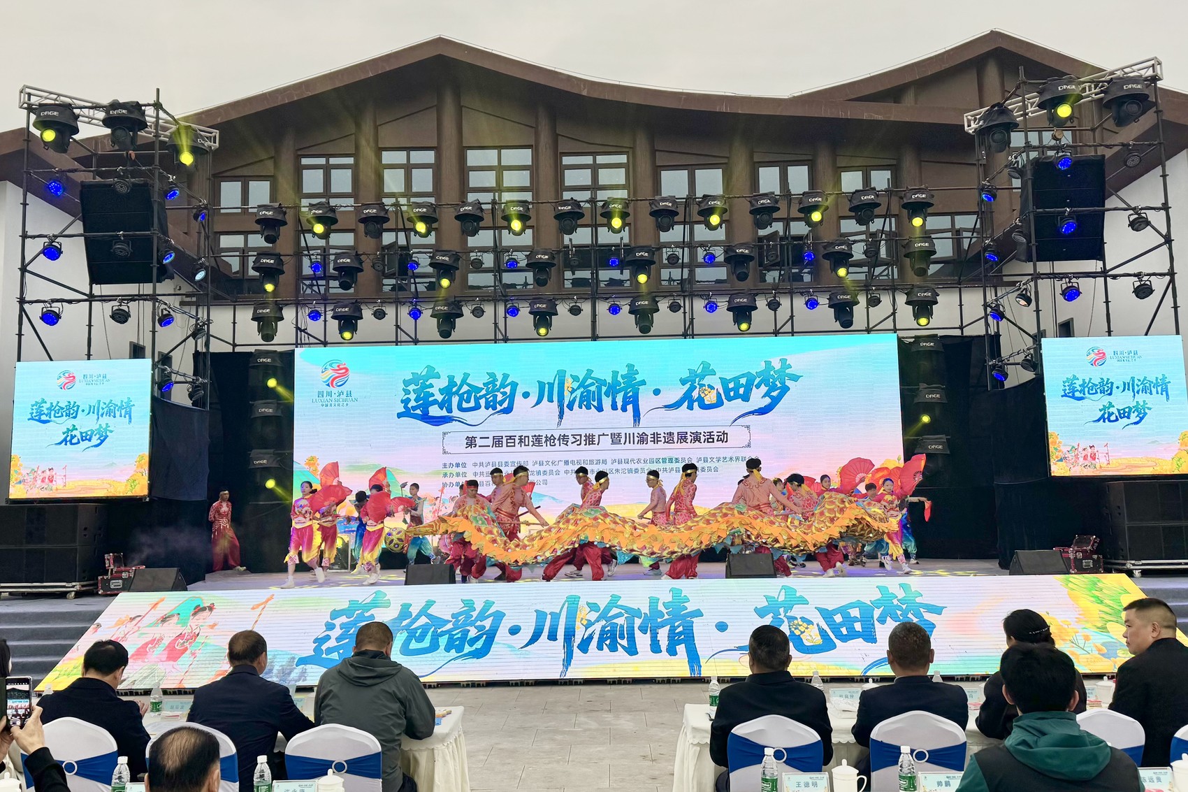泸县县委常委、宣传部部长王斌表示,随着成渝地区双城经济圈建设纵深推进,百和镇从传统腹地一跃成为联通川渝的“桥头堡”。“今天在这里举办川渝非遗展演,正是要以莲枪为纽带,让两地非遗同台竞艺、互鉴共荣,让川渝群众在文化共鸣中越走越近、越走越亲。”