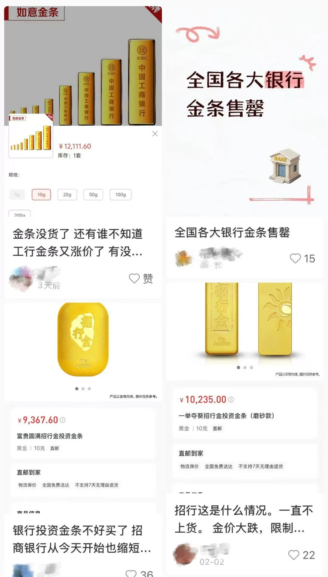 有网友表示不解:“实物黄金怎么一直售罄?黄金价格都还没企稳!到底是谁这么猛买!”也有网友讲述了自己抢购未果的经历:“早上开了个会,点进去发现显示‘所在开户行不支持购买’——估计是地区指标卖完了,下午直接都没得买了。”