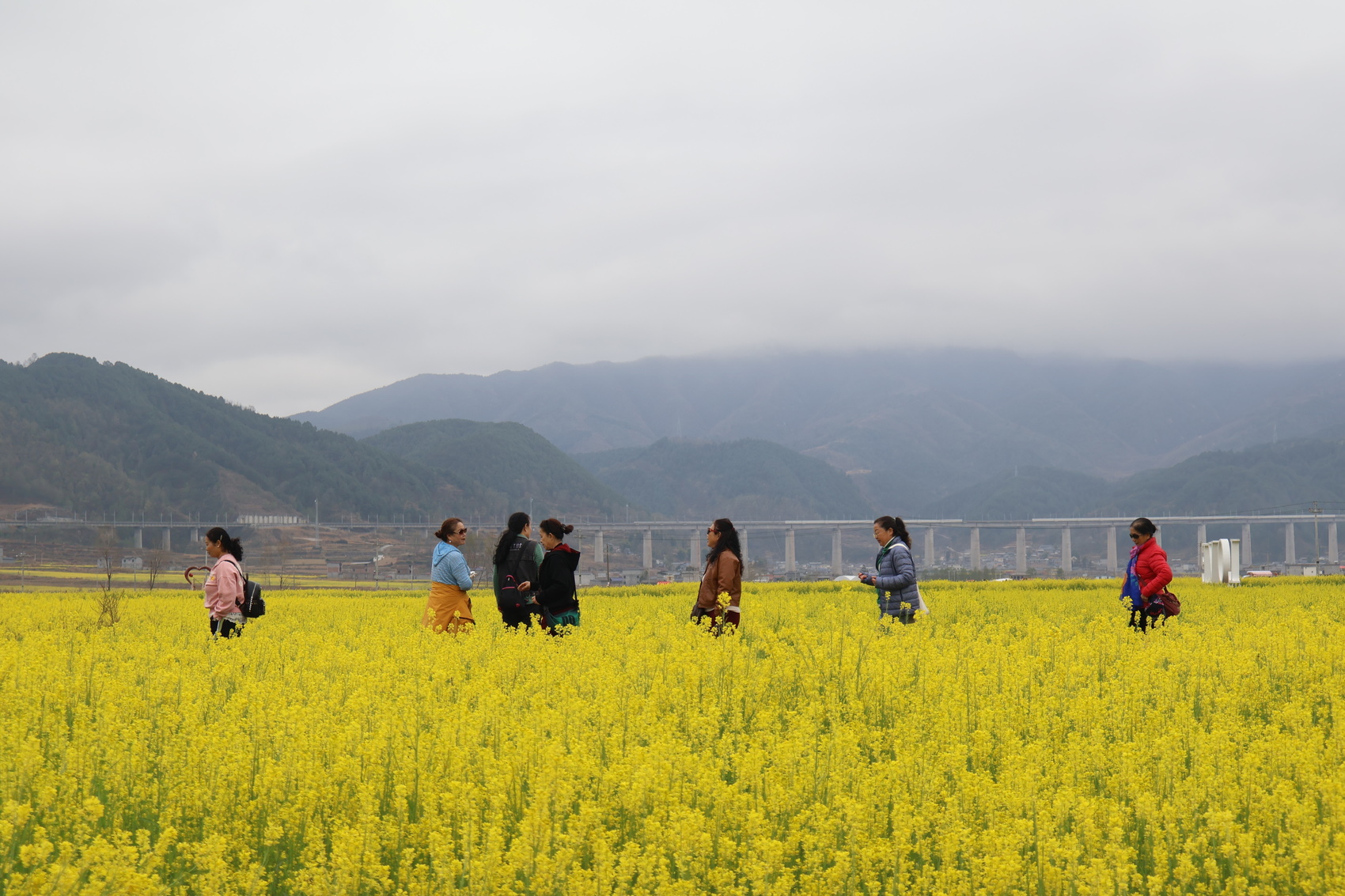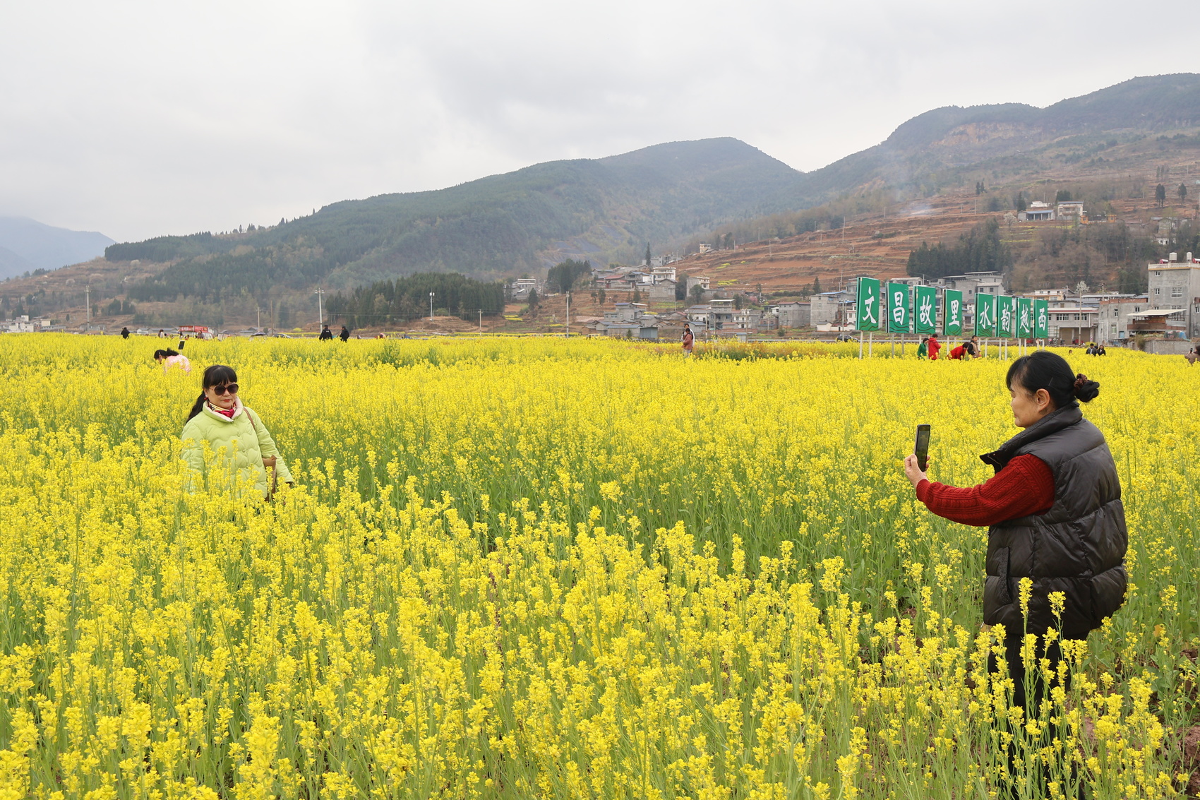 在大瑞镇,金黄的花浪随风起伏,与青山、成昆铁路复线相映成趣。游客穿梭于花间小径,姑娘们身着浅色长裙或鲜艳彝族服饰,定格“人比花娇”的春日记忆。主会场“花艺嶲州·春景影像展”吸引众多目光,展出作品从不同视角定格晨曦花浪、薄雾山水,让人们在赏花之余感受艺术气息。