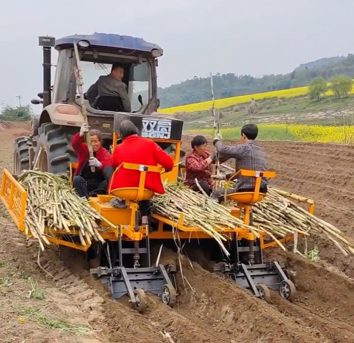 3月5日,在内江市市中区龙门镇甘家渡村一片刚刚整理出来的土地上,一台甘蔗播种机整装待发,几个农户忙前忙后地将一捆捆甘蔗种装上播种机。不一会,甘蔗播种机徐徐启动,4个农户每两个一组,挥刀将捆绑甘蔗种的蔗叶斩断,再将甘蔗种投进喂料口。一根根甘蔗种瞬间就被喂料口里锋利的刀片切成一节节约20厘米长的小段,直接“梭”到了土地“平躺”,迅速被两边的泥土覆盖,进而完成了播种。