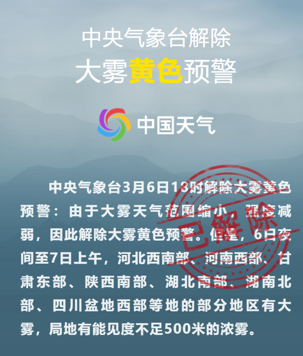 中央气象台3月6日18时解除大雾黄色预警:由于大雾天气范围缩小,强度减弱,因此解除大雾黄色预警。但是,6日夜间至7日上午,河北西南部、河南西部、甘肃东部、陕西南部、湖北南部、湖南北部、四川盆地西部等地的部分地区有大雾,局地有能见度不足500米的浓雾。