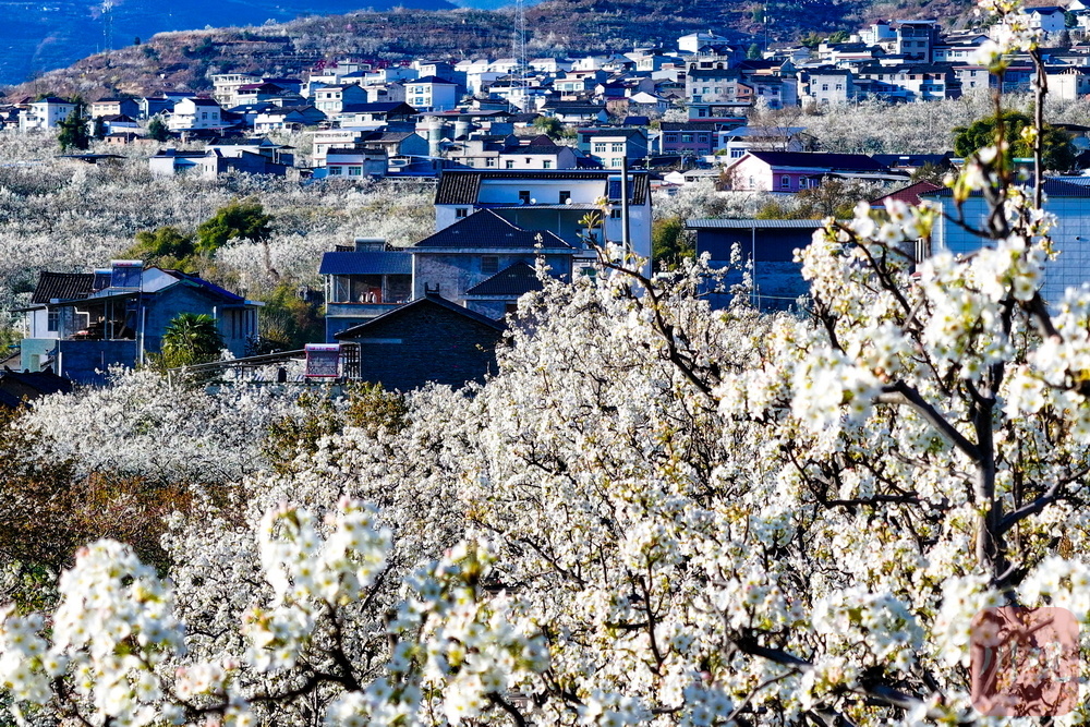 梨花枝头绽放,一朵朵、一树树、一片片,漫山遍野,洁白似雪,春风吹梻,送来阵阵清香,蝶飞蜂舞,让人眼花缭乱!