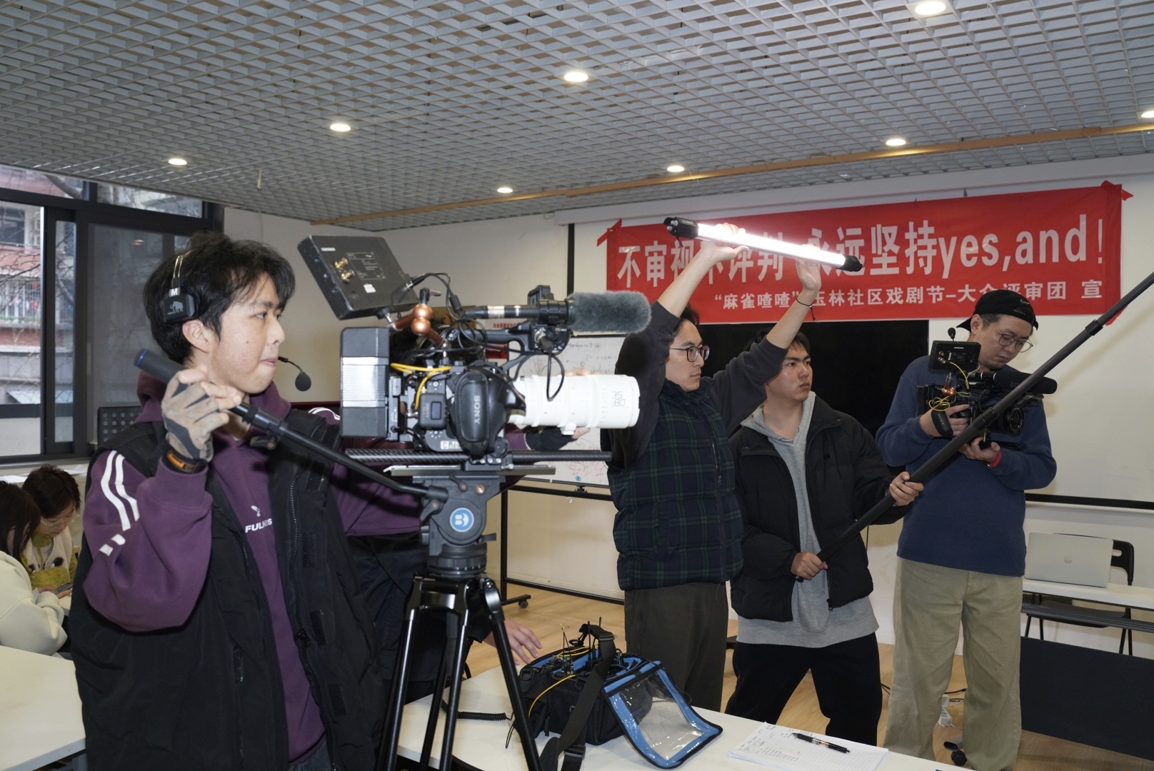 3月7日,成都春雨淅淅。成都玉东社区第四届“麻雀喳喳”戏剧节路演评审会正在进行,评委们围坐一圈,参赛者紧张候场,围观居民不时发出笑声。几个扛着摄像机的身影悄然穿行、全程记录——筹备一年多、由四川电影电视学院投资、国内非遗影像研究学者刘广宇率领的纪录电影《生活在玉林》正式开拍。这部“四川造”纪录电影,将用镜头直面成都本土生活,记录城市更新背景下的社区街坊故事。