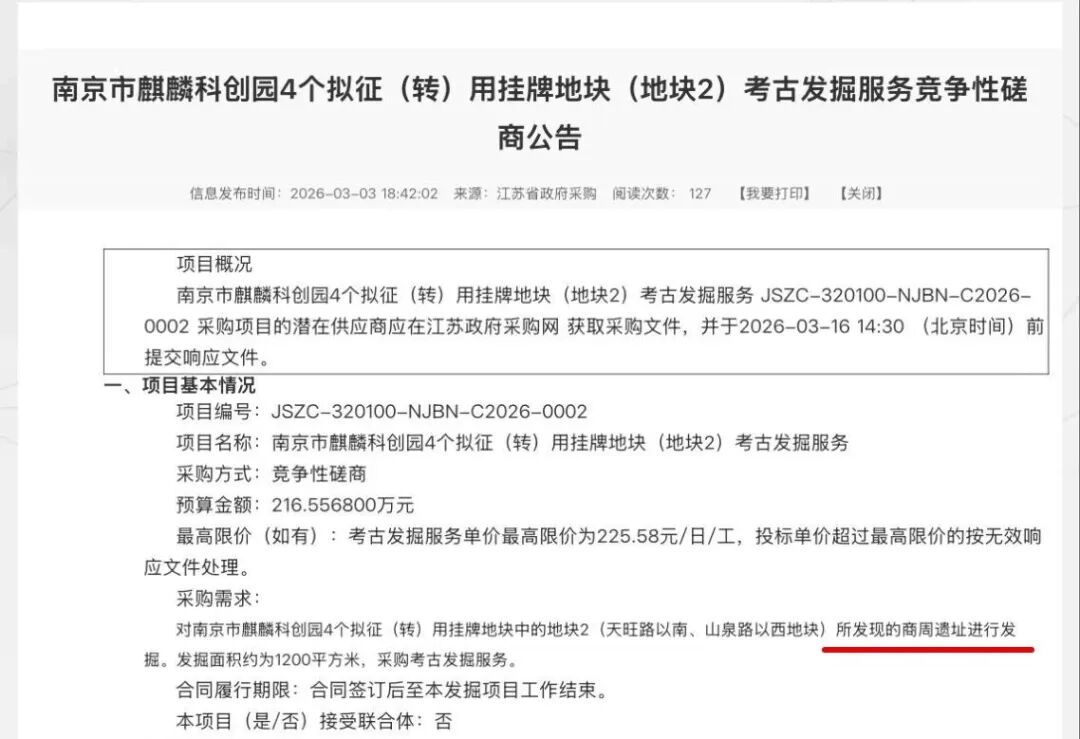 近日,江苏省政府采购网发布的《南京市麒麟科创园4个拟征(转)用挂牌地块(地块2)考古发掘服务竞争性磋商公告》显示,在地块中发现了商周遗址,官方计划采购考古发掘服务。