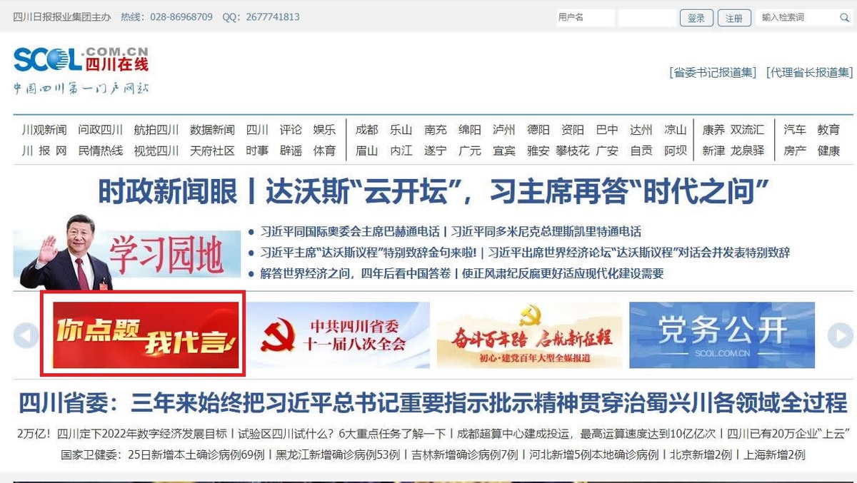 方式三:点击四川在线“你点题,我代言——四川日报全媒体邀您‘上两会’ 代表委员为你代言”活动链接(点这里<<<)或网址进行留言:https://topic.scol.com.cn/2021/21bxdt/