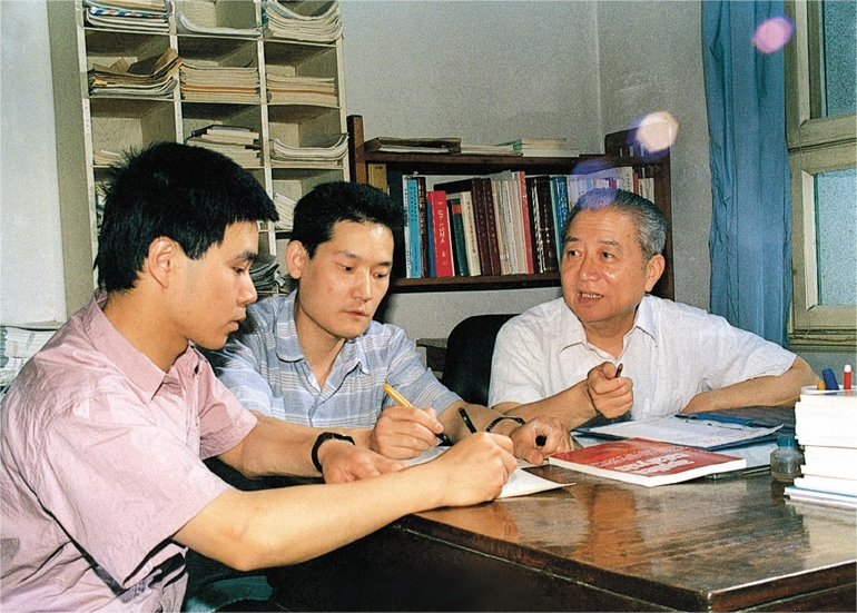 ▲1989年闵恩泽(右一)与学生讨论(图片来源:院士文库)