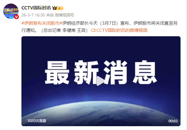 伊朗经济部长今天(3月7日)宣布,伊朗股市将关闭直至另行通知。