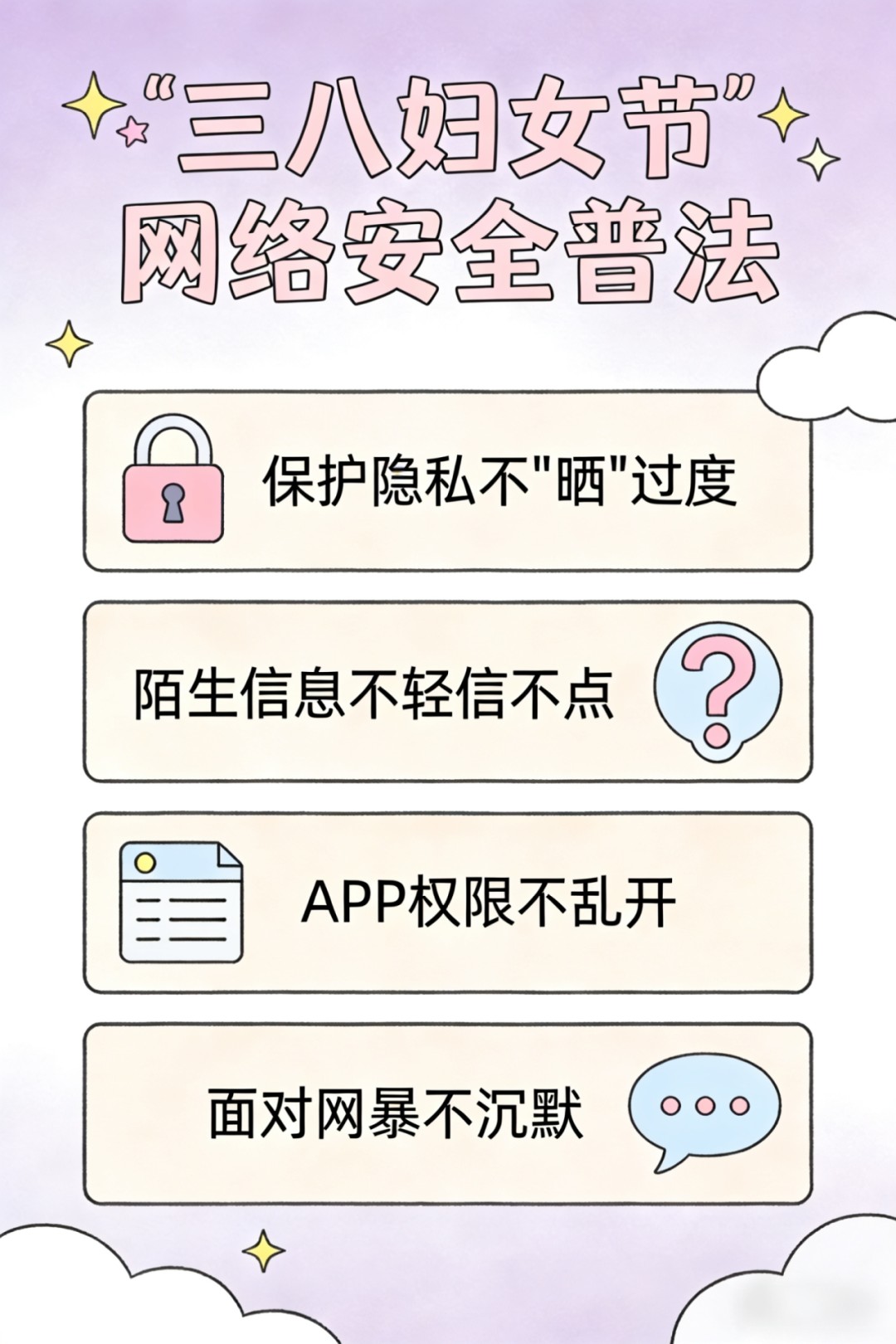 春风送暖,巾帼绽芳华。在“三八国际妇女节”即将到来之际,为更好守护广大女性朋友的人身安全、财产安全与人格尊严,筑牢网络安全法治防线,网警特别推出了网络安全普法宣传活动,愿每一位女性朋友在数字时代都能安心上网、放心用网、舒心生活。