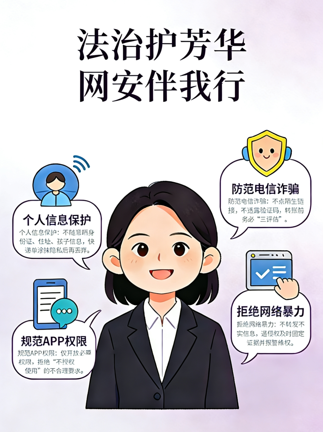 - 不跟风谩骂、不传播未经证实的消息、不转发他人隐私照片和视频。