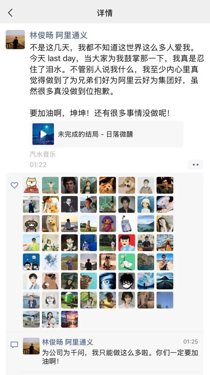 3月7日凌晨,阿里千问(Qwen)前负责人林俊旸在朋友圈发文告别阿里。他表示:“不是这几天,我都不知道这世界这么多人爱我。今天last day,当大家为我鼓掌那一下,我真是忍住了泪水。不管别人说我什么,我至少内心里真觉得做到了为兄弟们好为阿里云好为集团好,虽然很多真没做到位,抱歉。”