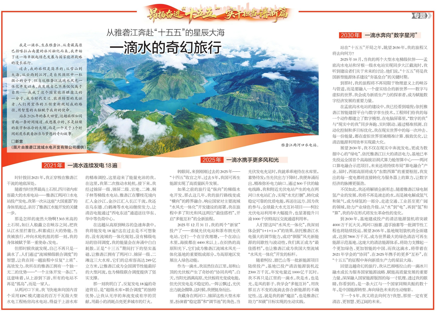 今年以来,“未来能源”成为热议词。在雅砻江,一滴江水的奇幻旅程,书写着水风光一体化开发的大国答卷。3月8日,四川日报以此为题,聚焦雅砻江践行新型能源体系建设的生动实践。