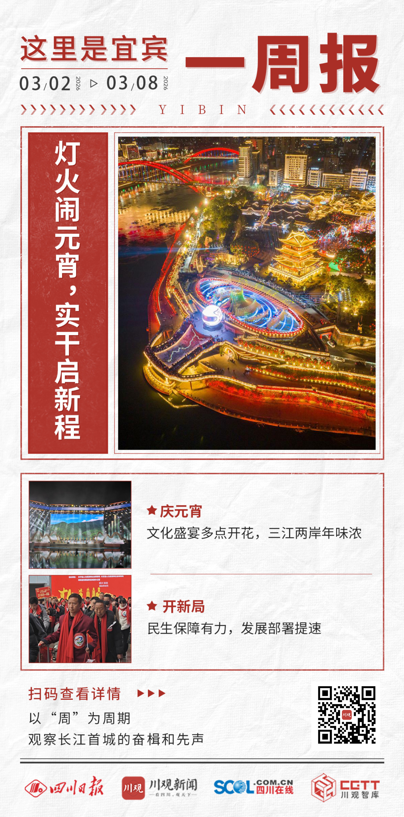 过去一周(3月2日至3月8日),元宵佳节的喜庆氛围充盈“长江首城”,宜宾各区县文化活动精彩纷呈、民生服务温暖贴心、发展部署密集落地……全市在热闹团圆中收心聚力、击鼓奋进。