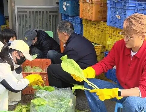 送走奶奶们后,吴克群带领粉丝,代替义工奶奶们在餐厅洗菜、择菜。